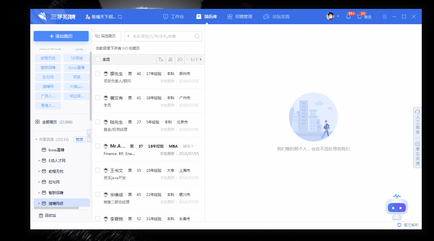 点击简历库的【添加简历】>选择【本地上传】,上传本地文件夹或本地简历文件,在右下角可以看到上传的进度和历史记录。